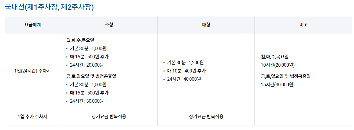 1일 주차요금(국내선 제1,2 주차장 국제선 주차장 화물청사 주차장)