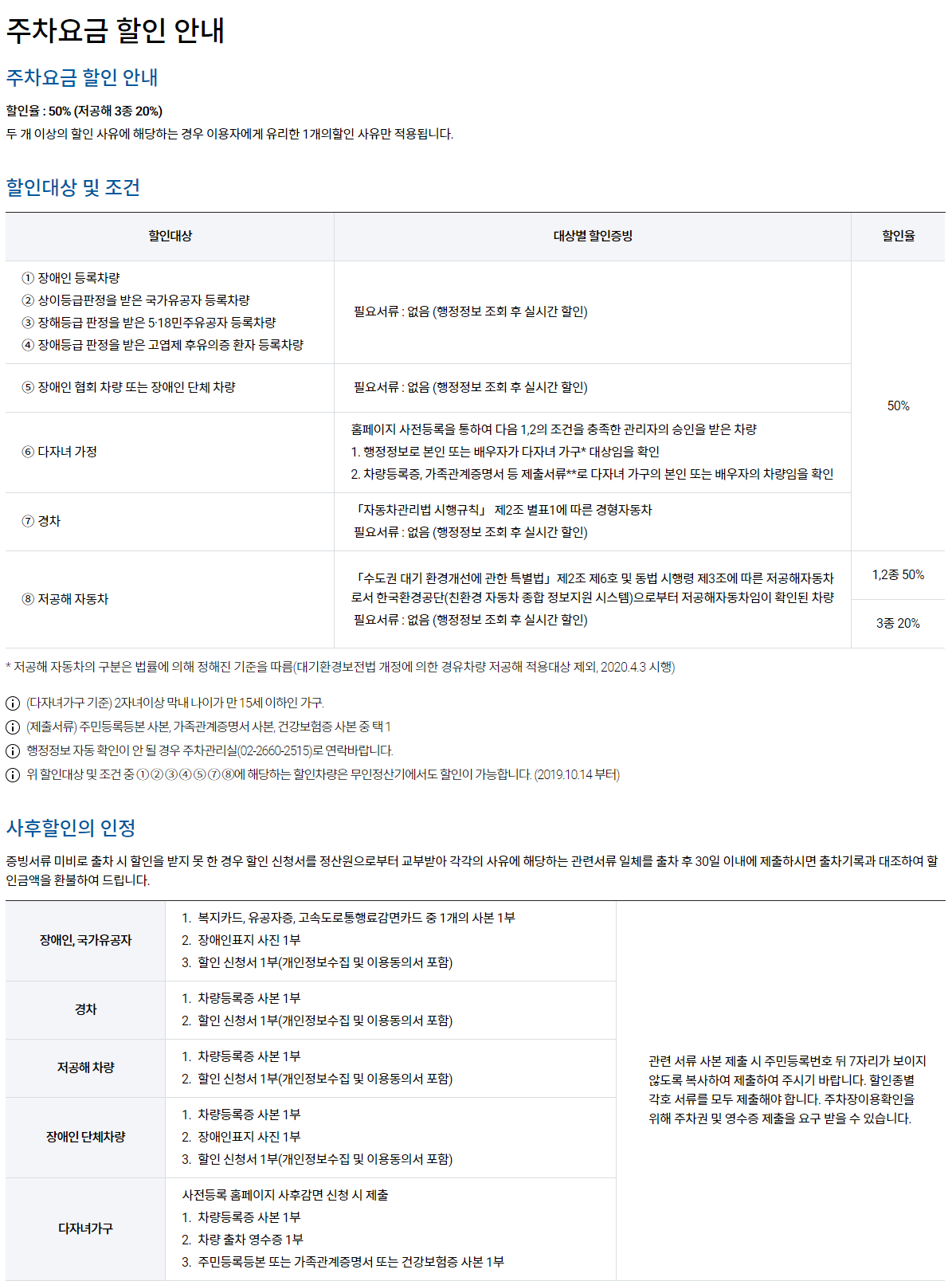 저공해 3종 차량만 할인율이 20%이고 그 외 8가지 대상에 대해서는 할인율이 50% 적용되고 있다