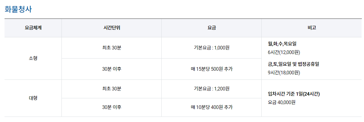 승용차 버스 화물차 특수차 각 차량별로 인승과 허용 무게에 따라서 소형과 대형으로 구분이 되며 각각의 요금이 차등 적용되기 때문에 주차하고자 하는 차량을 알고 주차 요금을 확인할 수 있다